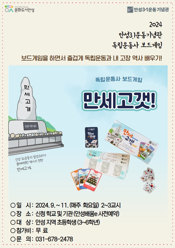 내 용: 안성지역의 독립운동사를 보드게임을 통해 쉽고 즐겁게 학습합니다.