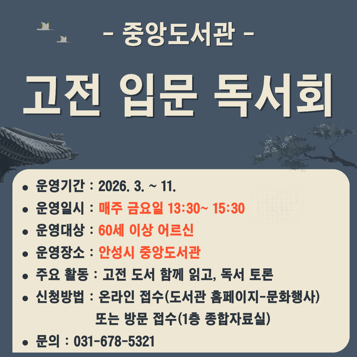 ❍ 접수방법 : 안성시 도서관 홈페이지 - 문화행사 - 도서관 행사 신청- 중앙도서관 어르신 독서회 신청