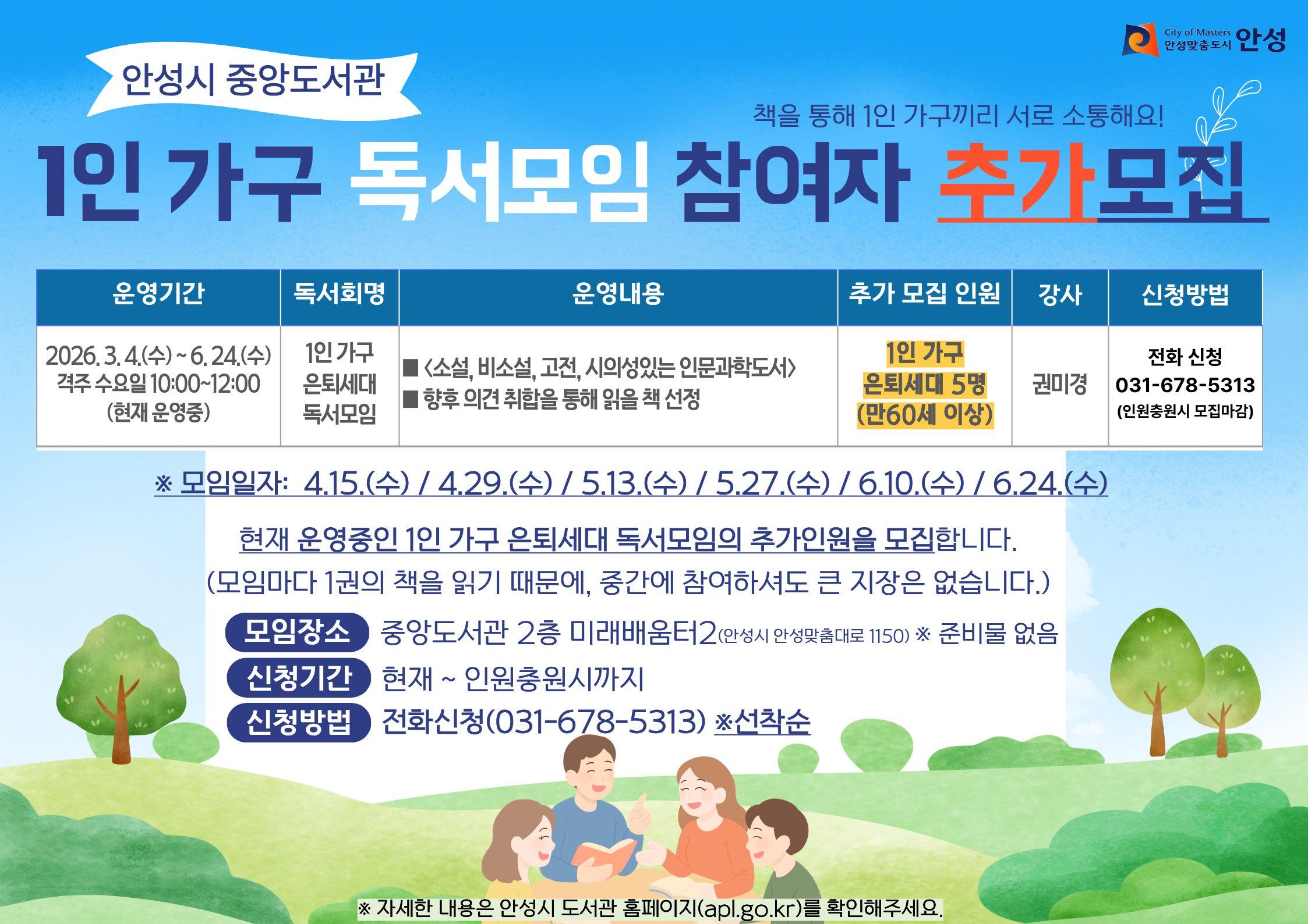 현재 운영중인 1인가구 독서모임(은퇴세대반)의 참여자를 추가모집하오니,